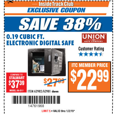 ITC UNION SAFE COMPANY 0.19 CU. FT. ELECTRONIC DIGITAL SAFE Lot No. 62981/62982 Expired: 9/30/19 - $22.99 Coupon Code: '32240618'