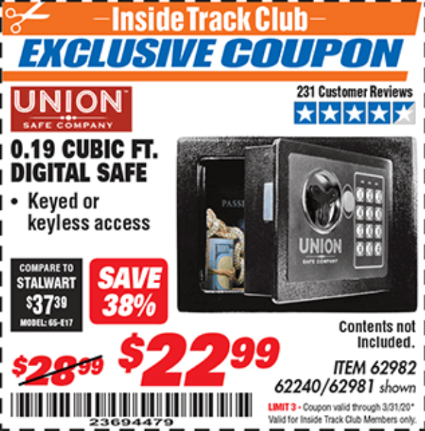 ITC UNION SAFE COMPANY 0.19 CU. FT. ELECTRONIC DIGITAL SAFE Lot No. 62981/62982 Expired: 3/31/20 - $22.99 Coupon Code: '23694479'