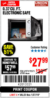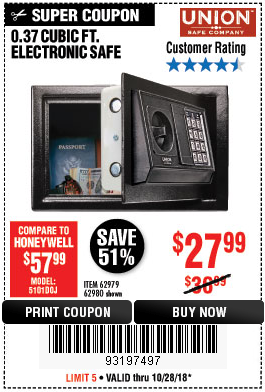 UNION SAFE COMPANY 0.37 CU. FT. ELECTRONIC DIGITAL SAFE Lot No. 62979/62980 Expired: 1/27/19 - $27.99 Coupon Code: '42013321'
