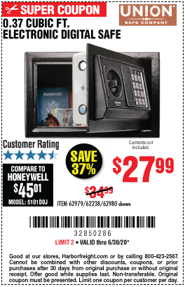 UNION SAFE COMPANY 0.37 CU. FT. ELECTRONIC DIGITAL SAFE Lot No. 62979/62980 Expired: 6/30/20 - $27.99 Coupon Code: '32850286'