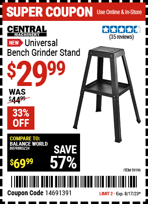 UNIVERSAL BENCH GRINDER STAND Lot No. 3184 Expired: 8/17/23 - $29.99 Coupon Code: '14691391'