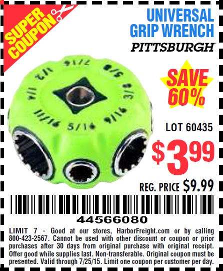 UNIVERSAL GRIP WRENCH Lot No. 60435 Expired: 7/25/15 - $3.99 Coupon Code: '44566080'
