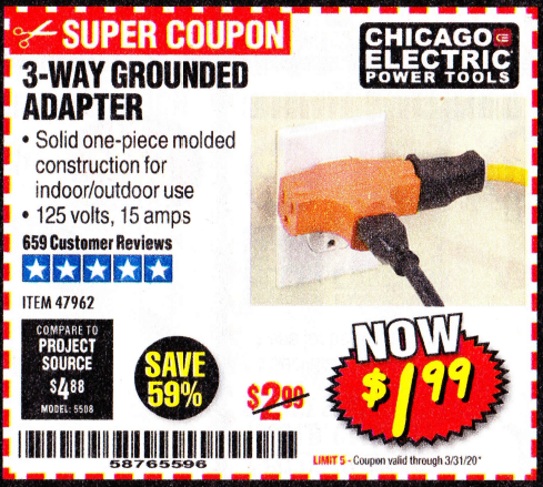 VANGUARD 3-WAY GROUNDED ADAPTER Lot No. 47962 Expired: 3/31/20 - $1.99 Coupon Code: '58765596'