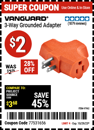 VANGUARD 3-WAY GROUNDED ADAPTER Lot No. 47962 Expired: 7/27/25 - $1.99 Coupon Code: '68246462'