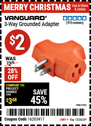 VANGUARD 3-WAY GROUNDED ADAPTER Lot No. 47962 Expired: 11/28/24 - $1.99 Coupon Code: '55757967'