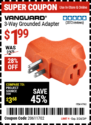 VANGUARD 3-WAY GROUNDED ADAPTER Lot No. 47962 Expired: 3/24/24 - $1.99 Coupon Code: '20611702'