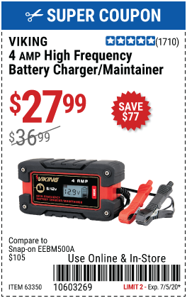 VIKING 4AMP 6/12 VOLT HIGH FREQ BATTERY CHARGER/MAINTAINER Lot No. 63350 Expired: 7/5/20 - $27.99 Coupon Code: '10603269'