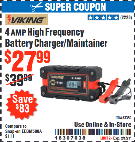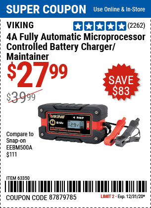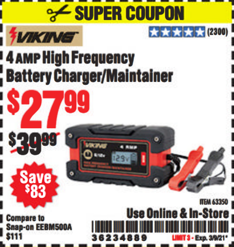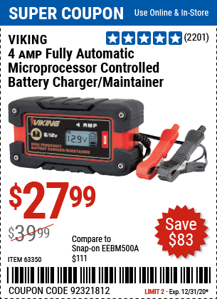 VIKING 4AMP 6/12 VOLT HIGH FREQ BATTERY CHARGER/MAINTAINER Lot No. 63350 Expired: 12/31/20 - $27.99 Coupon Code: '87879785'