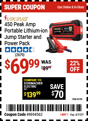 VIKING JUMP STARTER AND POWER PACK Lot No. 62749/64412/56798 Expired: 4/7/22 - $69.99 Coupon Code: '49694562'