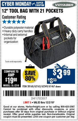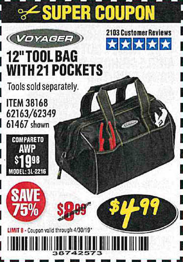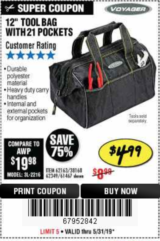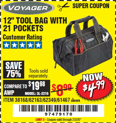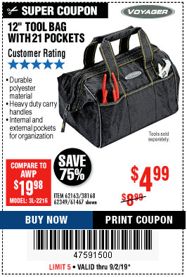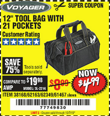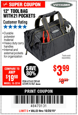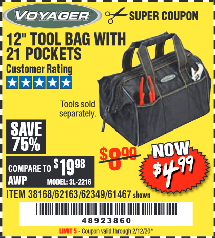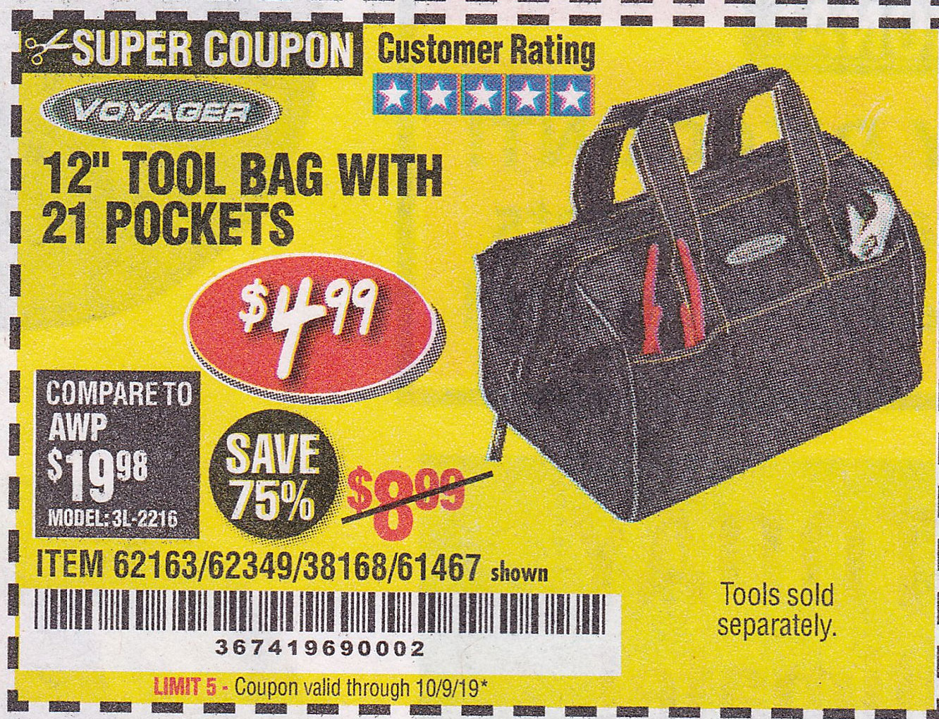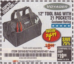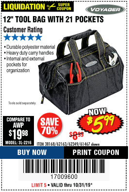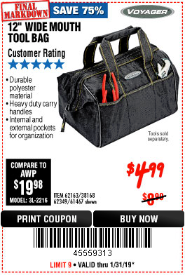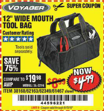 VOYAGER 12" WIDE MOUTH TOOL BAG Lot No. 38168/62163/62349/61467 Expired: 6/30/19 - $4.99 Coupon Code: '2221120'