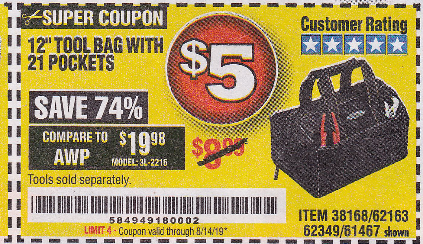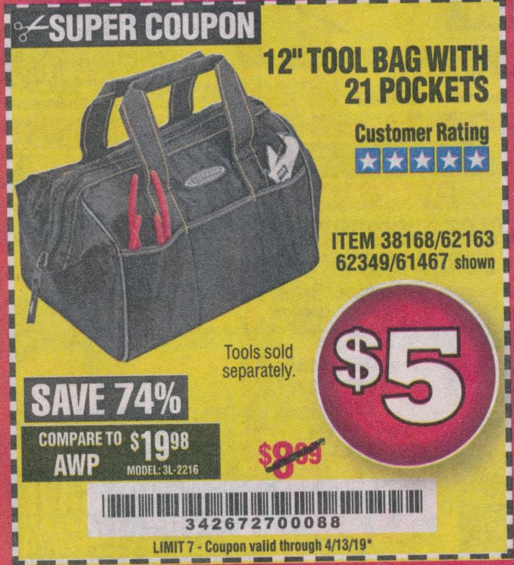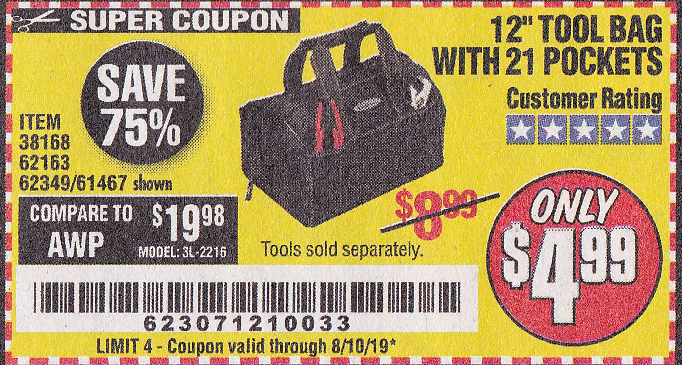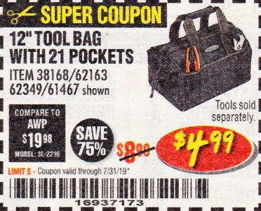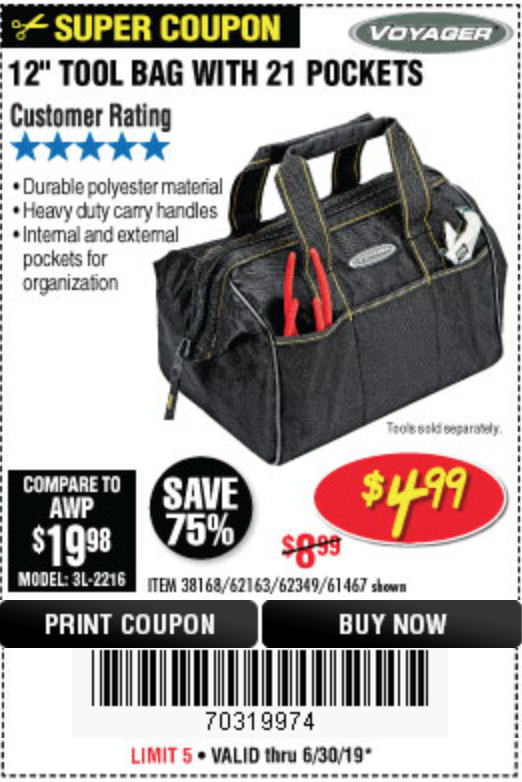 VOYAGER 12" WIDE MOUTH TOOL BAG Lot No. 38168/62163/62349/61467 Expired: 6/30/19 - $4.99 Coupon Code: '2221120'