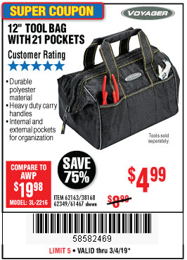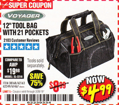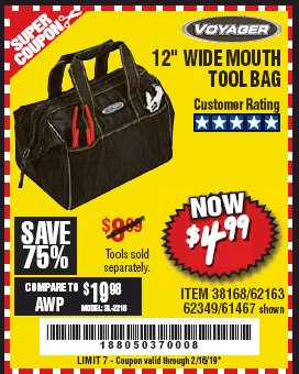 VOYAGER 12" WIDE MOUTH TOOL BAG Lot No. 38168/62163/62349/61467 Expired: 2/28/19 - $4.99 Coupon Code: '62239334'