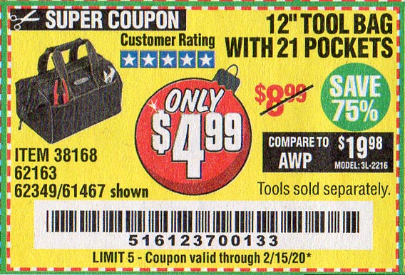 VOYAGER 12" WIDE MOUTH TOOL BAG Lot No. 38168/62163/62349/61467 Expired: 2/15/20 - $4.99 Coupon Code: '51612370'