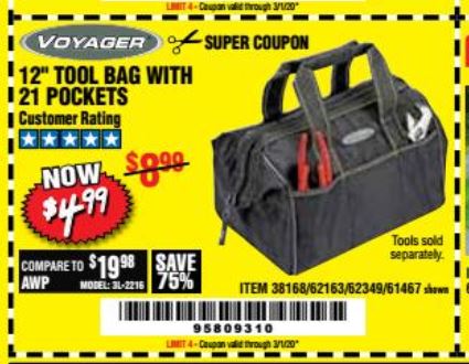 VOYAGER 12" WIDE MOUTH TOOL BAG Lot No. 38168/62163/62349/61467 Expired: 3/1/20 - $4.99 Coupon Code: '95809310'