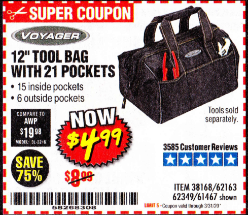VOYAGER 12" WIDE MOUTH TOOL BAG Lot No. 38168/62163/62349/61467 Expired: 3/31/20 - $4.99 Coupon Code: '37131920'
