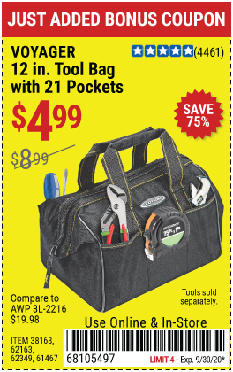 VOYAGER 12" WIDE MOUTH TOOL BAG Lot No. 38168/62163/62349/61467 Expired: 9/30/20 - $4.99 Coupon Code: '68105497'