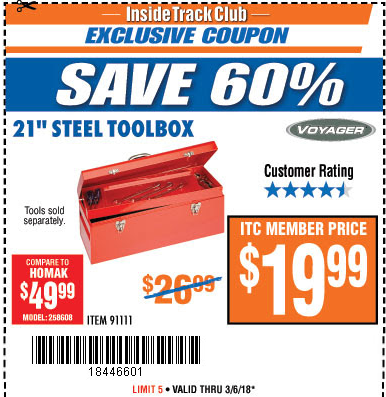 ITC VOYAGER 21 IN. STEEL TOOLBOX Lot No. 91111 Expired: 3/6/18 - $19.99 Coupon Code: '18446601'