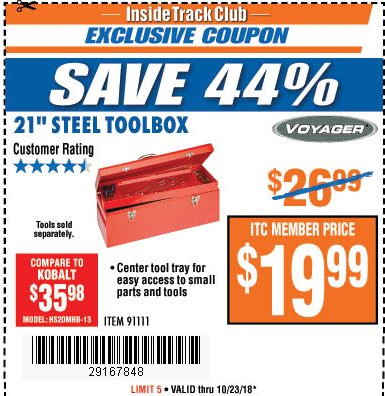 ITC VOYAGER 21 IN. STEEL TOOLBOX Lot No. 91111 Expired: 10/23/18 - $19.99 Coupon Code: '6741709'