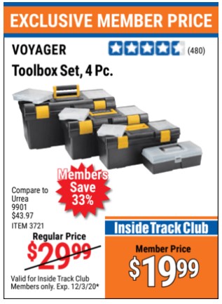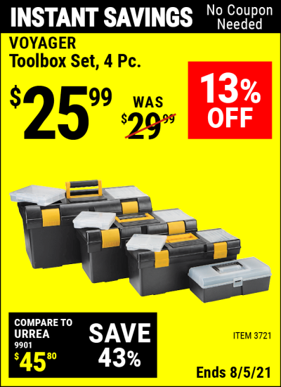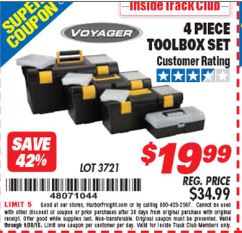 VOYAGER TOOLBOX SET, 4-PIECE Lot No. 3721 Expired: 8/5/21 - $25.99 Coupon Code: 'n/a'