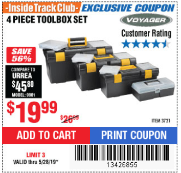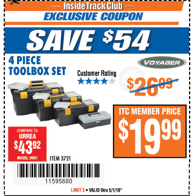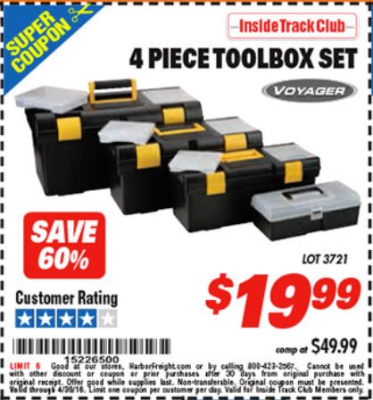 ITC VOYAGER TOOLBOX SET, 4-PIECE Lot No. 3721 Expired: 4/30/16 - $19.99 Coupon Code: '15226500'