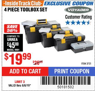 ITC VOYAGER TOOLBOX SET, 4-PIECE Lot No. 3721 Expired: 8/6/19 - $19.99 Coupon Code: '50181502'
