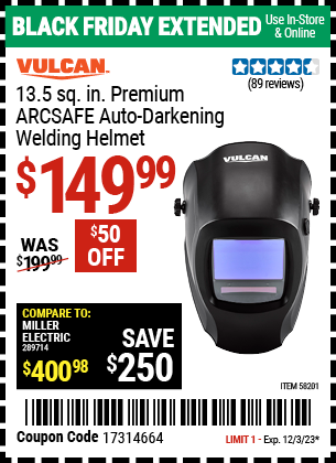 VULCAN 13.5 SQ. IN. PREMIUM ARCSAFE AUTO-DARKENING WELDING HELMET Lot No. 58201 Expired: 12/3/23 - $149.99 Coupon Code: '17314664'