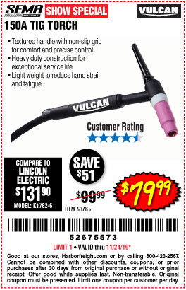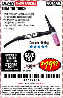 VULCAN 150A TIG TORCH Lot No. 63785 Expired: 11/24/19 - $79.99 Coupon Code: '49614710'