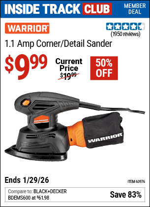 ITC WARRIOR 1.1 AMP CORNER/DETAIL SANDER Lot No. 63976 Valid Thru: 1/29/26 - $9.99 Coupon Code: 'n/a' (current price - 10% = 0) add to list