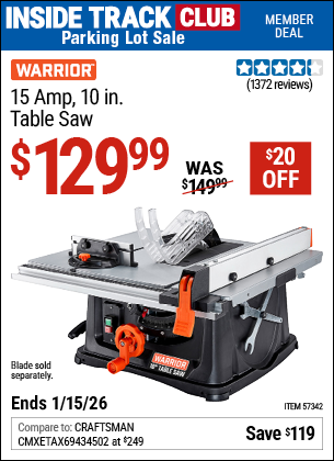 WARRIOR 15 AMP, 10 IN. TABLE SAW Lot No. 57342 Expired: 12/31/69 - $129.99 Coupon Code: 'n/a'