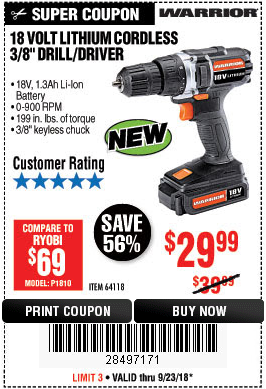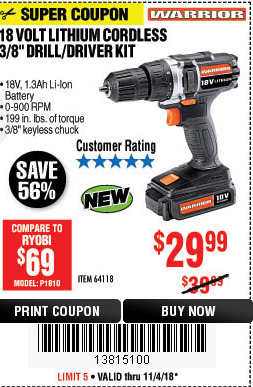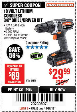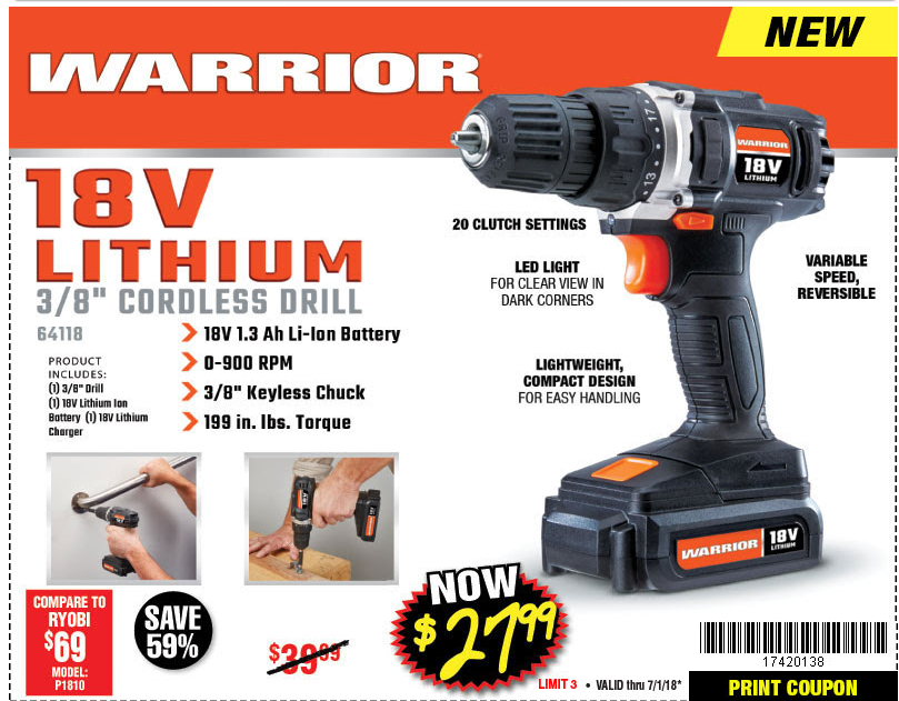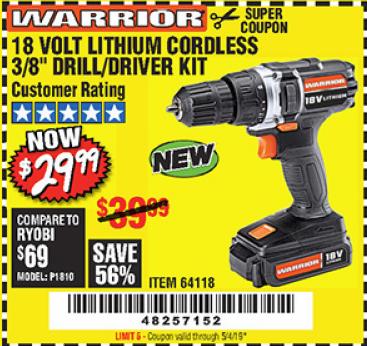 WARRIOR 18V CORDLESS, 3/8 IN. DRILL KIT WITH BATTERY AND CHARGER Lot No. 58389/64118/56122 Expired: 2/17/19 - $29.99 Coupon Code: '41715805'
