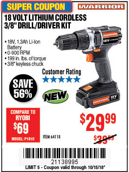 WARRIOR 18V CORDLESS, 3/8 IN. DRILL KIT WITH BATTERY AND CHARGER Lot No. 58389/64118/56122 Expired: 10/15/18 - $29.99 Coupon Code: '21138995'