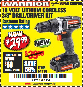 WARRIOR 18V CORDLESS, 3/8 IN. DRILL KIT WITH BATTERY AND CHARGER Lot No. 58389/64118/56122 Expired: 4/1/19 - $29.99 Coupon Code: '22794524'