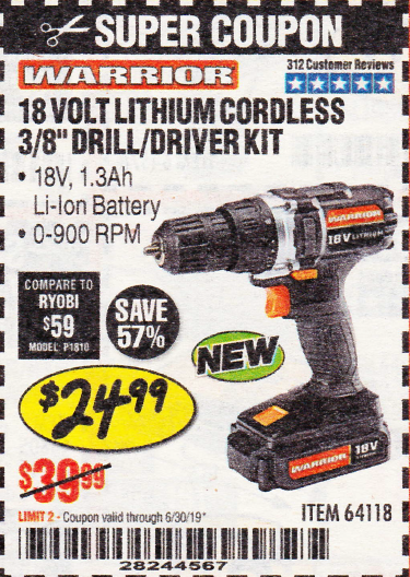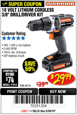 WARRIOR 18V CORDLESS, 3/8 IN. DRILL KIT WITH BATTERY AND CHARGER Lot No. 58389/64118/56122 Expired: 6/30/19 - $29.99 Coupon Code: '70251204'