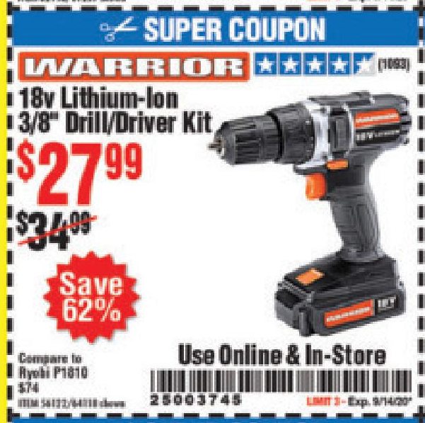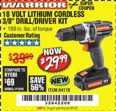 WARRIOR 18V CORDLESS, 3/8 IN. DRILL KIT WITH BATTERY AND CHARGER Lot No. 58389/64118/56122 Expired: 9/3/19 - $29.99 Coupon Code: '32642209'