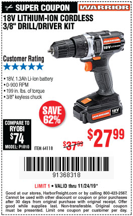 WARRIOR 18V CORDLESS, 3/8 IN. DRILL KIT WITH BATTERY AND CHARGER Lot No. 58389/64118/56122 Expired: 11/24/19 - $27.99 Coupon Code: '91368318'