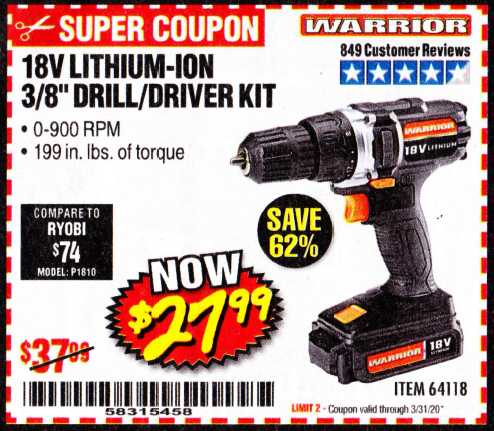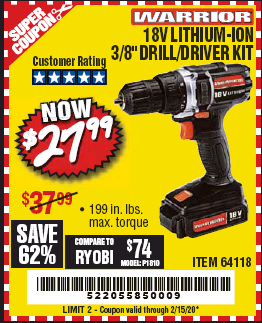 WARRIOR 18V CORDLESS, 3/8 IN. DRILL KIT WITH BATTERY AND CHARGER Lot No. 58389/64118/56122 Expired: 2/15/20 - $27.99 Coupon Code: '52205585'