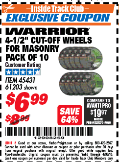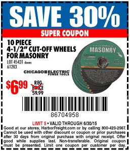 WARRIOR 4-1/2 IN. X 1/16 IN. X 7/8 IN. TYPE 01/41 MASONRY CUT-OFF WHEEL, 10-PACK Lot No. 45431/61203 Expired: 6/30/15 - $6.99 Coupon Code: '86704958'