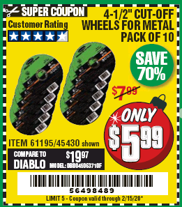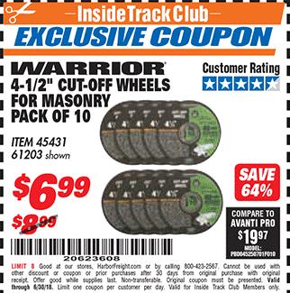WARRIOR 4-1/2 IN. X 1/16 IN. X 7/8 IN. TYPE 01/41 MASONRY CUT-OFF WHEEL, 10-PACK Lot No. 45431/61203 Expired: 2/15/20 - $5.99 Coupon Code: '56498489'