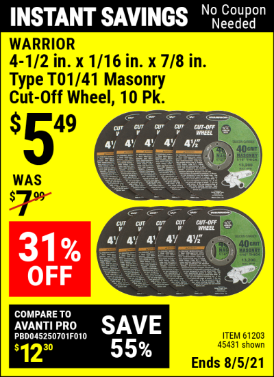 WARRIOR 4-1/2 IN. X 1/16 IN. X 7/8 IN. TYPE 01/41 MASONRY CUT-OFF WHEEL, 10-PACK Lot No. 45431/61203 Expired: 8/5/21 - $5.49 Coupon Code: 'n/a'