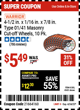 WARRIOR 4-1/2 IN. X 1/16 IN. X 7/8 IN. TYPE 01/41 MASONRY CUT-OFF WHEEL, 10-PACK Lot No. 45431/61203 Expired: 4/24/22 - $5.49 Coupon Code: '21664160'