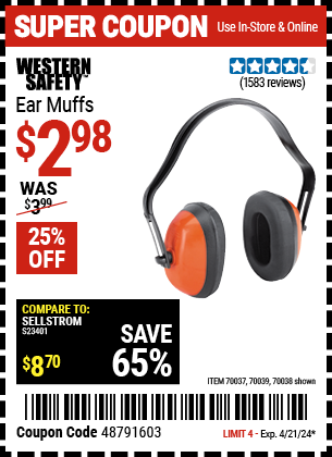 WESTERN SAFETY EAR MUFFS Lot No. 70038/70037 Valid Thru: 4/9/26 - $2.99 Coupon Code: 'n/a' (current price - 20% = 0) add to list