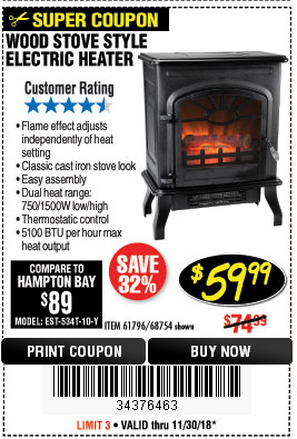 WOOD STOVE STYLE ELECTRIC HEATER Lot No. 61796/68754 Expired: 11/30/18 - $59.99 Coupon Code: '34376463'