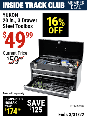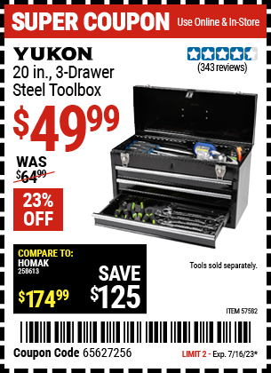 YUKON 20 IN. 3-DRAWER STEEL TOOLBOX Lot No. 57582 Expired: 7/16/23 - $44.99 Coupon Code: '65627256'