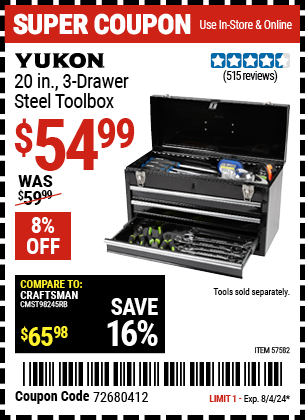 YUKON 20 IN. 3-DRAWER STEEL TOOLBOX Lot No. 57582 Expired: 8/4/24 - $54.99 Coupon Code: '72680412'