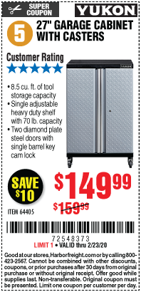 YUKON 27" GARAGE CABINET WITH CASTERS Lot No. 64405 Expired: 2/23/20 - $149.99 Coupon Code: '72548373'