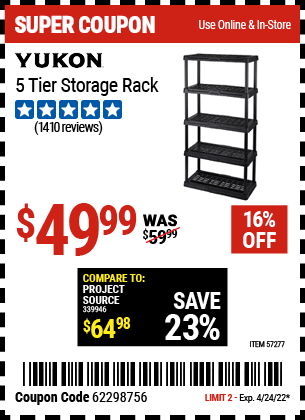 YUKON 5-TIER SHELF, 36 IN. X 18 IN. X 72 IN. Lot No. 57277 Expired: 4/24/22 - $49.99 Coupon Code: '21438314'
