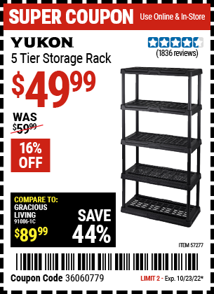 YUKON 5-TIER SHELF, 36 IN. X 18 IN. X 72 IN. Lot No. 57277 Expired: 10/23/22 - $49.99 Coupon Code: '36060779'