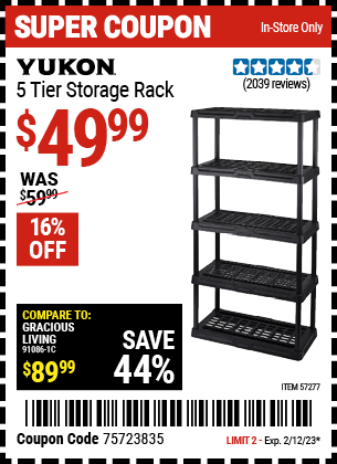 YUKON 5-TIER SHELF, 36 IN. X 18 IN. X 72 IN. Lot No. 57277 Expired: 2/12/23 - $49.99 Coupon Code: '75723835'