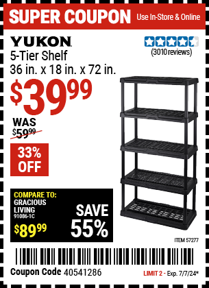 YUKON 5-TIER SHELF, 36 IN. X 18 IN. X 72 IN. Lot No. 57277 Expired: 7/7/24 - $39.99 Coupon Code: '40541286'