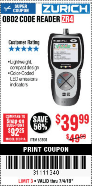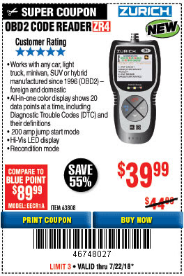 ZURICH OBD2 CODE READER ZR4 Lot No. 63808 Expired: 6/30/18 - $39.99 Coupon Code: '10336969'
